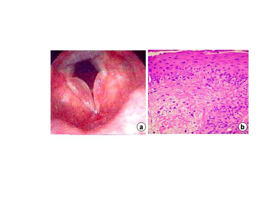 Em a - exame endoscópico de edema de Reinke bilateral. Em b - carcinoma espinocelular microinvasivo, infiltrando a membrana basal (HE-40X- microsocpia de luz).